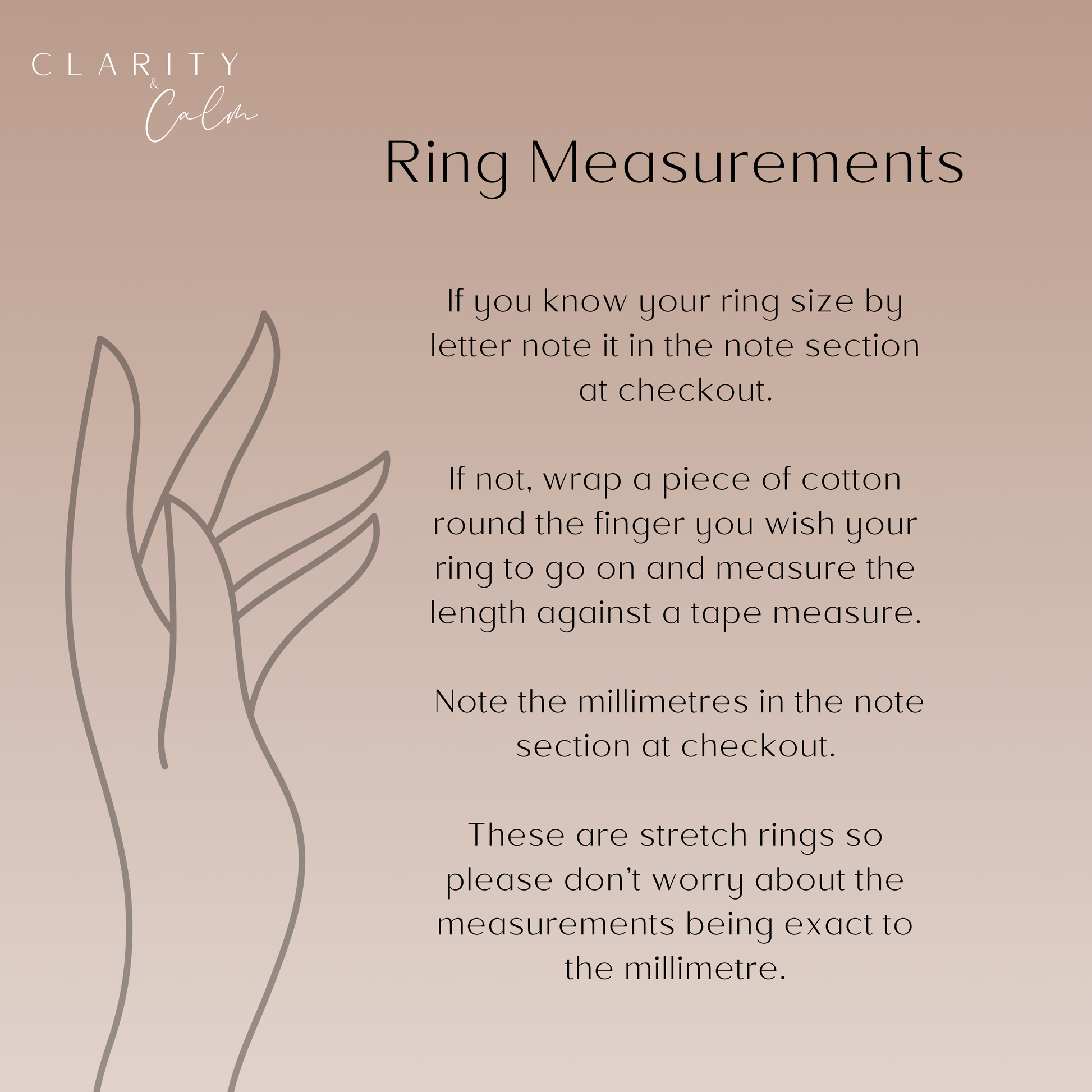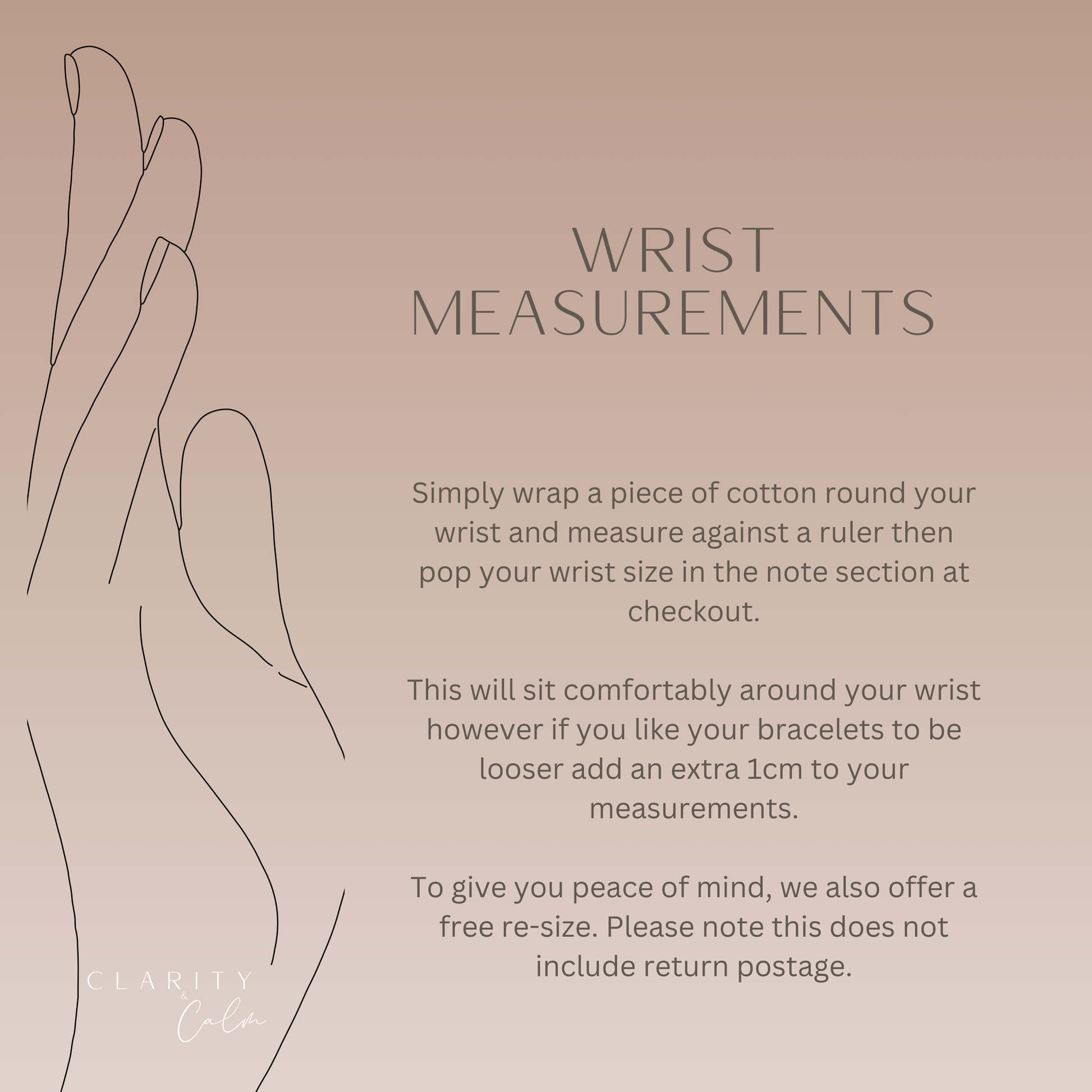 Custom Fit: Free made-to-measure option — simply follow our measuring guide (pictured) and email your wrist size + order number to clarityandcalm103@gmail.com by 31st October.